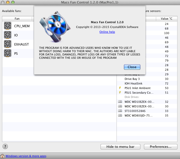 Macs Fan Control 1.1.12.3, MacPro1,1, Mac OS X 10.7